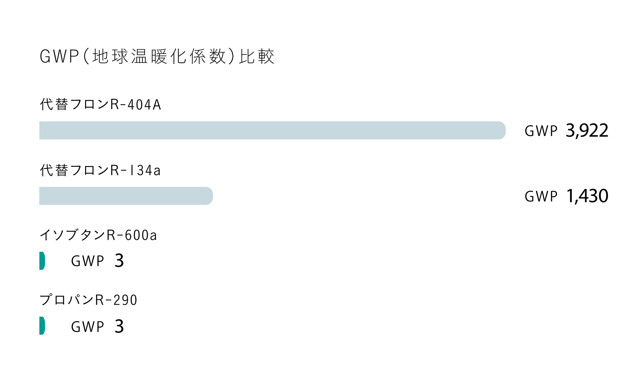 4 今回発表製品と同等の当社の既存製品ではR134aまたはR404Aを使用しており、国連環境計画(UNEP)の「OzonAction Kigali Fact Sheet 3」ではGWP値は1430(R134a)、3922(R404A)となっています。