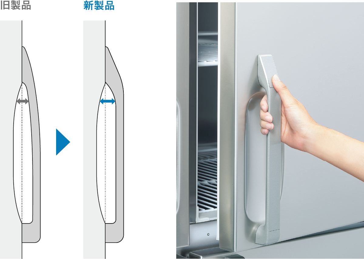 ● ドアの開閉をスムーズにおこなえるよう、ハンドルの手前部分を曲線から直線的な形状に変更し、握れる範囲を拡大しました。