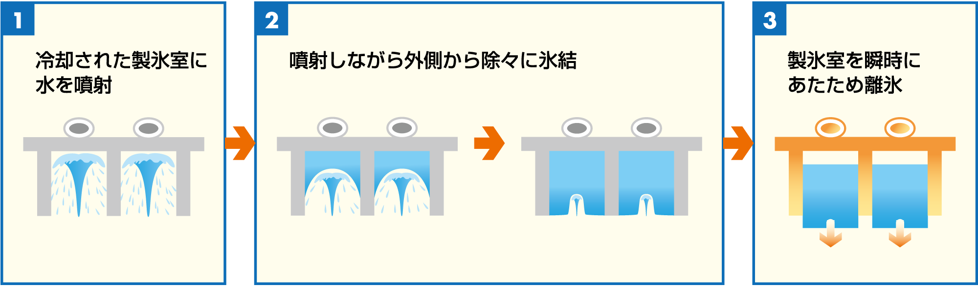 「キューブアイスメーカー」は、ジュース、水、アイスコーヒー、水割りなどに使われる、約3センチの立方体に近い、透明な氷の製氷機です。零下25℃に冷却された製氷室に下から水を噴射しながら製氷します。水を流動させながら徐々に凍らせることで不純物を除去し、透明で溶けにくい氷となります。ホシザキの国内製氷機標準ラインナップの約7割を占めています。