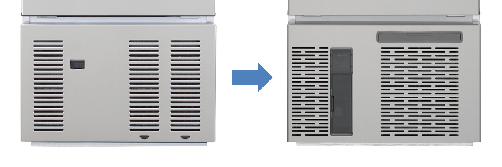 4:水冷機(水で冷やす方式の冷却ユニット搭載機)はフィルターがないため、フィルターランプ、前面フィルターは対象外。卓上タイプは7セグメント、ランプ表示なし。卓上、スタックオンタイプは前モデルより前面フィルター脱着が可能