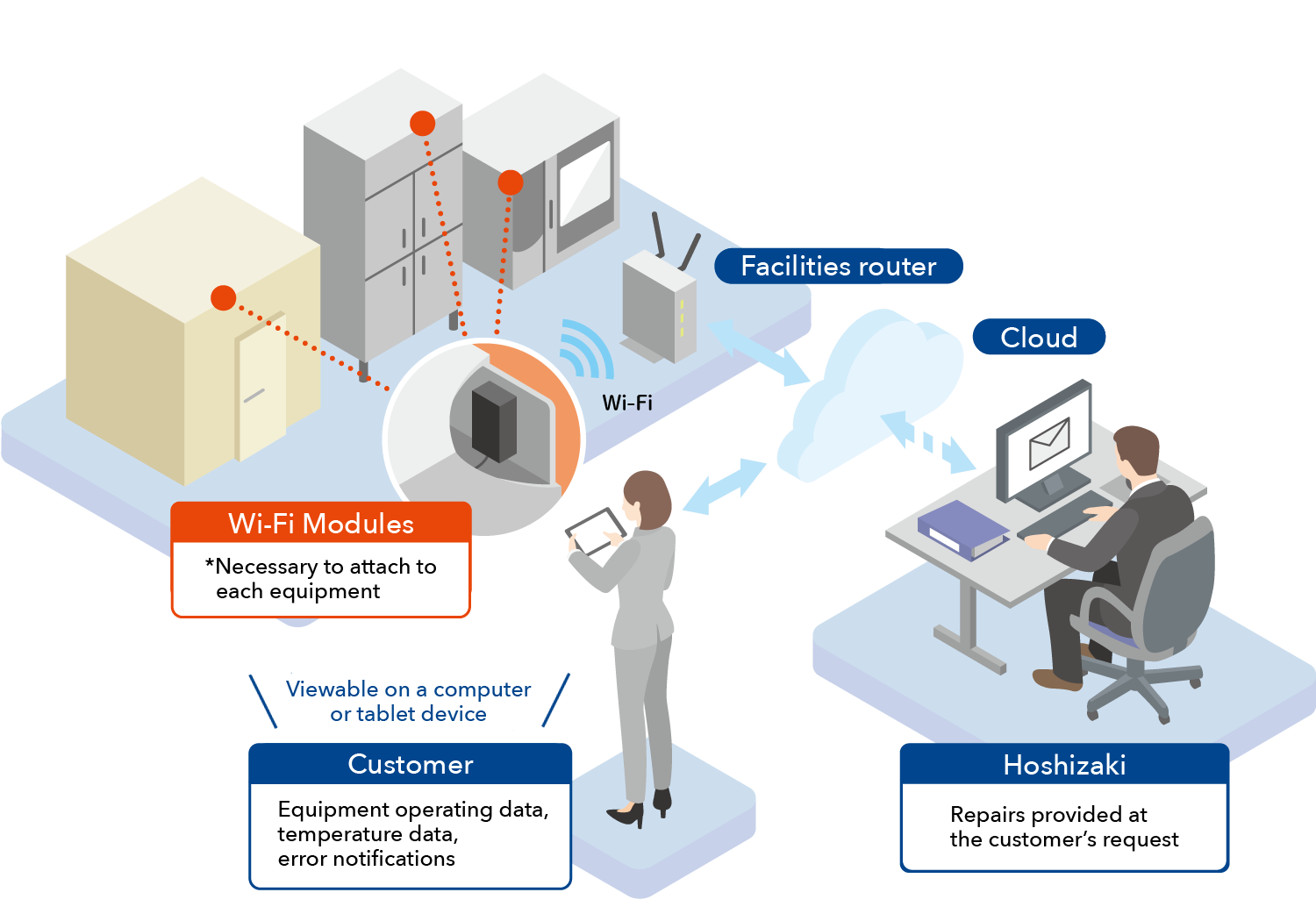 Using the SaaS developed proprietarily by Hoshizaki, customers will be able to confirm, manage, and record in real time the operating status and temperature of multiple equipment in multiple locations on a computer, tablet, or other device over the internet anytime and anywhere. Wi-Fi modules that attach to each equipment will be provided and installed free of charge, so the initial cost is zero. A service fee of ¥1,000 per equipment per month (before tax) will be charged and the number of equipment that may be connected is at least one and there is no upper limit.3 Customers using Hoshizaki Connect Wi-Fi are allowed to freely set the number of users, viewing and management authorization, alarm notification conditions, and where error notifications are sent when generated by the equipment.