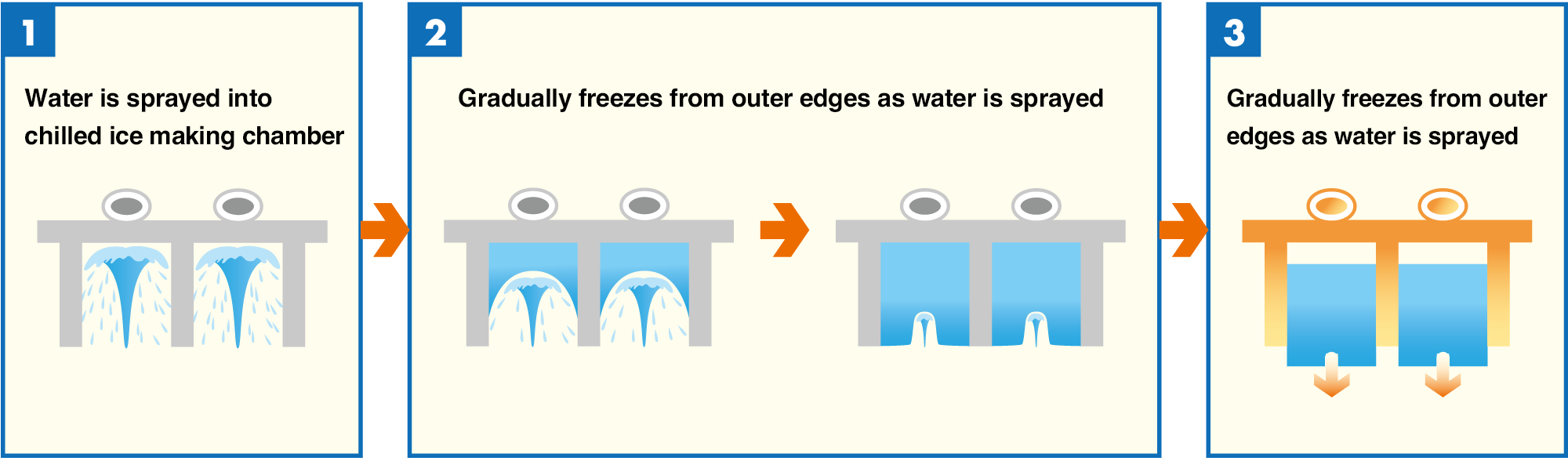 A cube ice maker is an ice machine that makes clear ice cubes of about 3 cm for use in beverages such as juice and soft drinks, iced coffee, water, and spirits mixed with water. The ice is formed by water being sprayed from below into an ice making chamber that has been refrigerated to -25°C. Keeping the water flowing while freezing it gradually removes impurities, resulting in clear, slow-melting ice. Cube ice makers account for approximately 70% of Hoshizaki’s standard lineup of ice makers in the Japanese market.