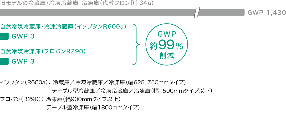 2:自然冷媒とは、自然界にもともと存在する物質を使って冷凍用や空調用の冷媒に使用できる物質です。オゾン層破壊係数(ODP、Ozone Depletion Potential)がゼロ、かつ、地球温暖化係数 (GWP、Global Warming Potential)が非常に低い、地球に優しい冷媒のことです。GWPは、二酸化炭素(CO2)を1とした場合に、その温室効果ガスの温暖化の大きさを表した数値です。当社の採用するイソブタン(R600a)、プロパン(R290)のGWPは、国連環境計画(UNEP)の「OzonAction Kigali Fact Sheet 3」(2017年公開)では3、世界気象機関(WMO)(国連の専門機関)の「Scientific Assessment of Ozone Depletion: 2022」(2022年10月発行)では「<<1」(1より非常に小さい)となっています。